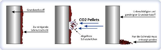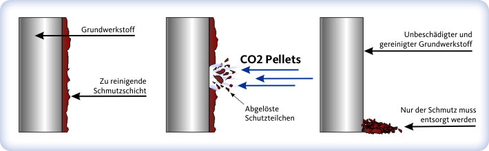 Durch die entstandene Thermospannung löst sich die Schicht vom Grundmaterial. Mit Hilfe der Geschwindigkeit der nachfolgend auftreffenden Pellets wird die Beschichtung dann vollständig abgetragen. Der Erfolg hat also zwei Ursachen: zum einen den Thermo-Effekt - zum anderen den mechanischen Effekt. Im Gegensatz zum bekannten Sandstrahlen wird die Grundoberfläche hier jedoch nicht beschädigt!